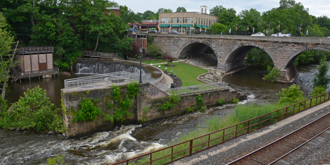 PUBLIC GATHERING SPACE: River can be diverted around the historic dam. A public gathering space can be constructed adjacent to the historic structure and a water feature installed to maintain the aesthetics of the waterfall.
