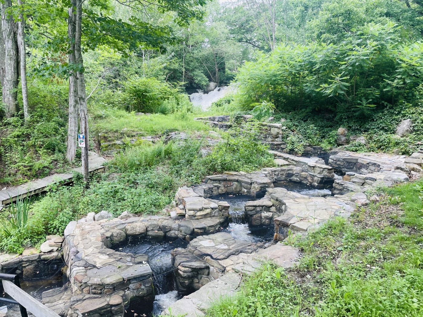 With strong community organizing, and fundraising, the reconstruction of the fish ladder began in 2007. The redesign and reconstruction of the fish ladder is similar to that of the original, consisting of a series of 69 ascending pools connected by weirs, or short waterfall passageways that each rise 8-10 inches. The reconstruction took over 10 years and could only take place from November - April to avoid spawning season. In April every year, the construction team had to stop so the ladder could be used for the spring migration. The renovated ladder winds 1,500 feet up the hill and was reconstructed using the original stones and designed to weave around mature trees that shade the pools.