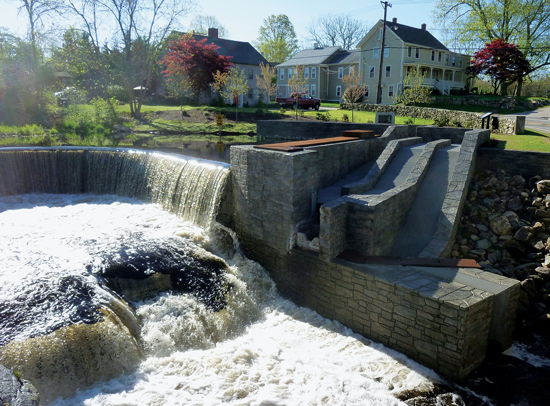 Due to the dam’s scenic beauty and historical importance, the restoration project required sustained outreach to ensure all stakeholders were heard and all interests were met. An elaborate state of the art Denil fishway was designed to allow alewife and eel passage. To ensure the fishway did not look out of place, engineers shaped the exterior of the fishway to match the stones of the original mill foundation on the opposite bank.