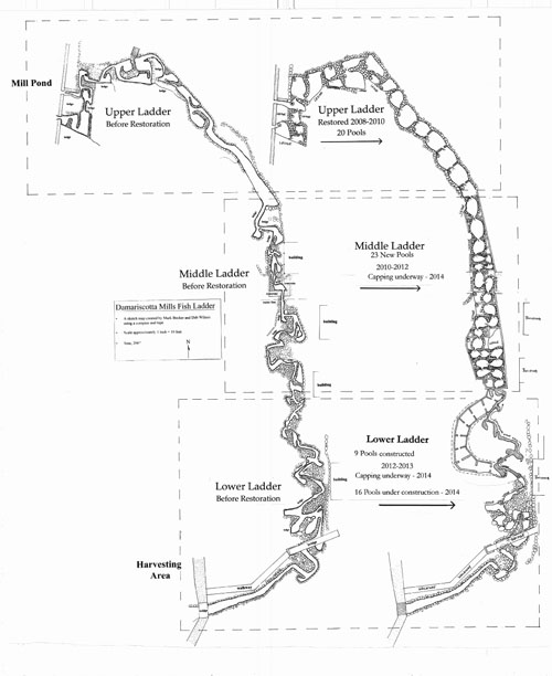 The original fish ladder was a series of small pools connected by short passages that raised over 42 feet from the bay to the impoundment. The fish ladder worked well for about 180 years but its stonework and the underlying concrete deteriorated as ice dislodged stones and blocked the path for the fish. By the 1990s, the fish ladder was in very poor condition, and fish count plummeted to less than 200,000.