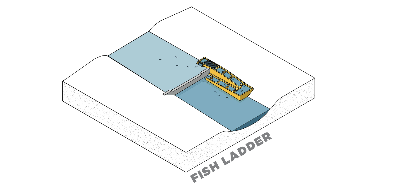 A conventional fishway, commonly nicknamed “fish ladder,” is a structure that is built alongside an existing dam that is intended to provide a corridor for aquatic species to swim up and over the dam barrier, then back down. Conventional fishways may be an option where there is a desire to provide some fish passage without removing the dam. Selecting the most appropriate fishway for a given project will depend upon the slope, budget, flow conditions, and target species.