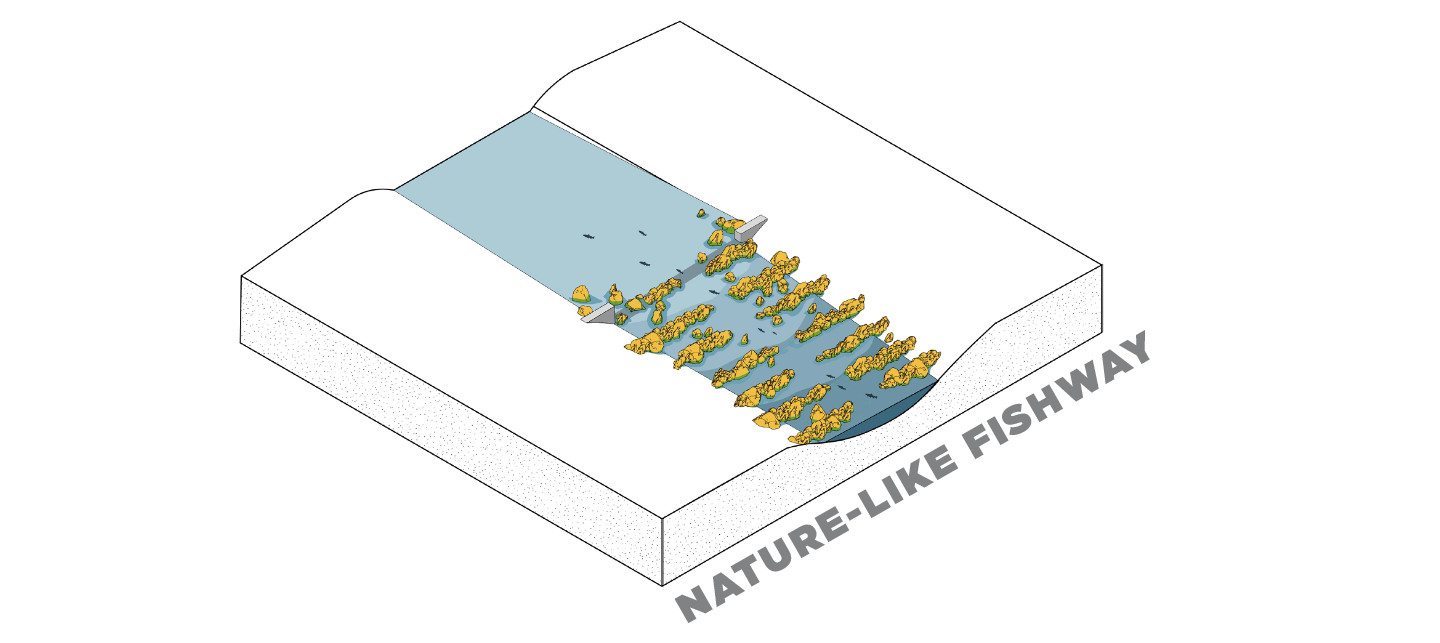A nature-like fishway resembles a natural river with a series of pools and riffles. It consists of a wide, low-gradient channel that is constructed with rocks and boulders that are gradually terraced to make up the height difference between the below-dam and above-dam elevation. Boulders in the channel create multiple pathways that vary in length and velocity to allow multiple fish species to swim upstream. Because nature-like fishways are wide and gradual channels, they also provide improved fish habitat connectivity up and downstream. Nature-like fishways may be suitable for low height obstructions, where upstream water level control is not essential, and if there is a need or desire to preserve the upstream impoundment due to recreation, well water, contaminants or habitat. Nature-like fishways vary in cost, aesthetics, and performance depending on the design and dam structure.