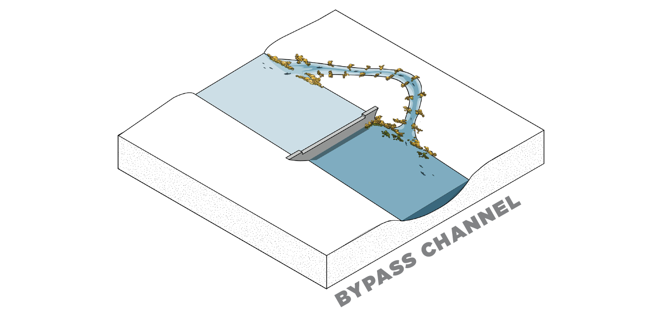 In this scenario, the river downstream of the dam is gradually raised to the elevation of the dam across the whole river channel through a series of rock/pools. Because the fishway spans the whole width of the river channel, the dam is no longer visible. In this scenario, there needs to be sufficient space downstream to build up the channel gradually to the height of the dam. Frequently, the dam is partially lowered to reduce the elevation the downstream channel has to be raised. In addition to full width nature-like fishways, there is an option for partial width fishways that only extend across a portion of the river width.