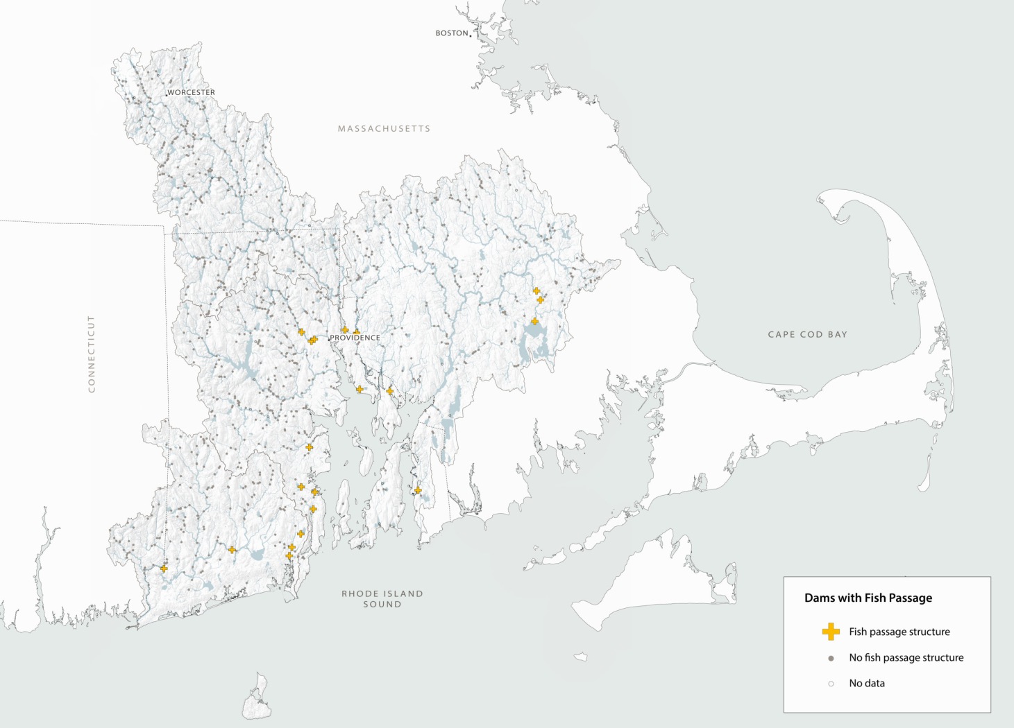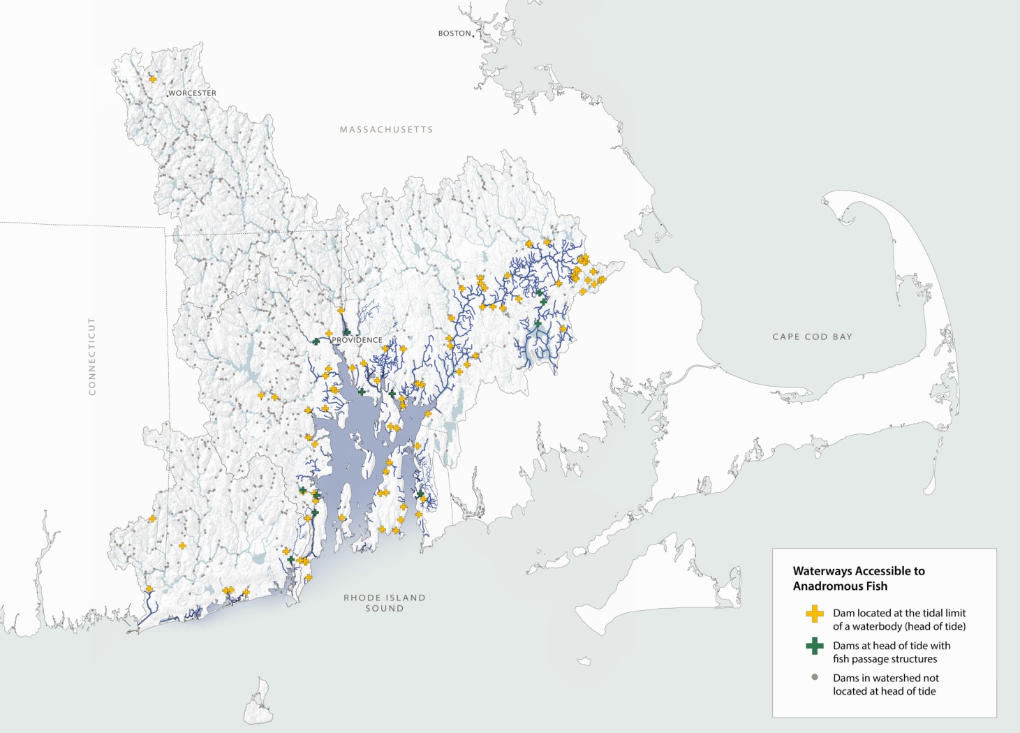 Anadromous fish passage at head of tide dams (dams located at the farthest point upstream where a river is affected by tidal fluctuations) within Narragansett Bay and coastal watersheds. A dam in the middle of a forest may have a different level of attachment than one in the middle of town