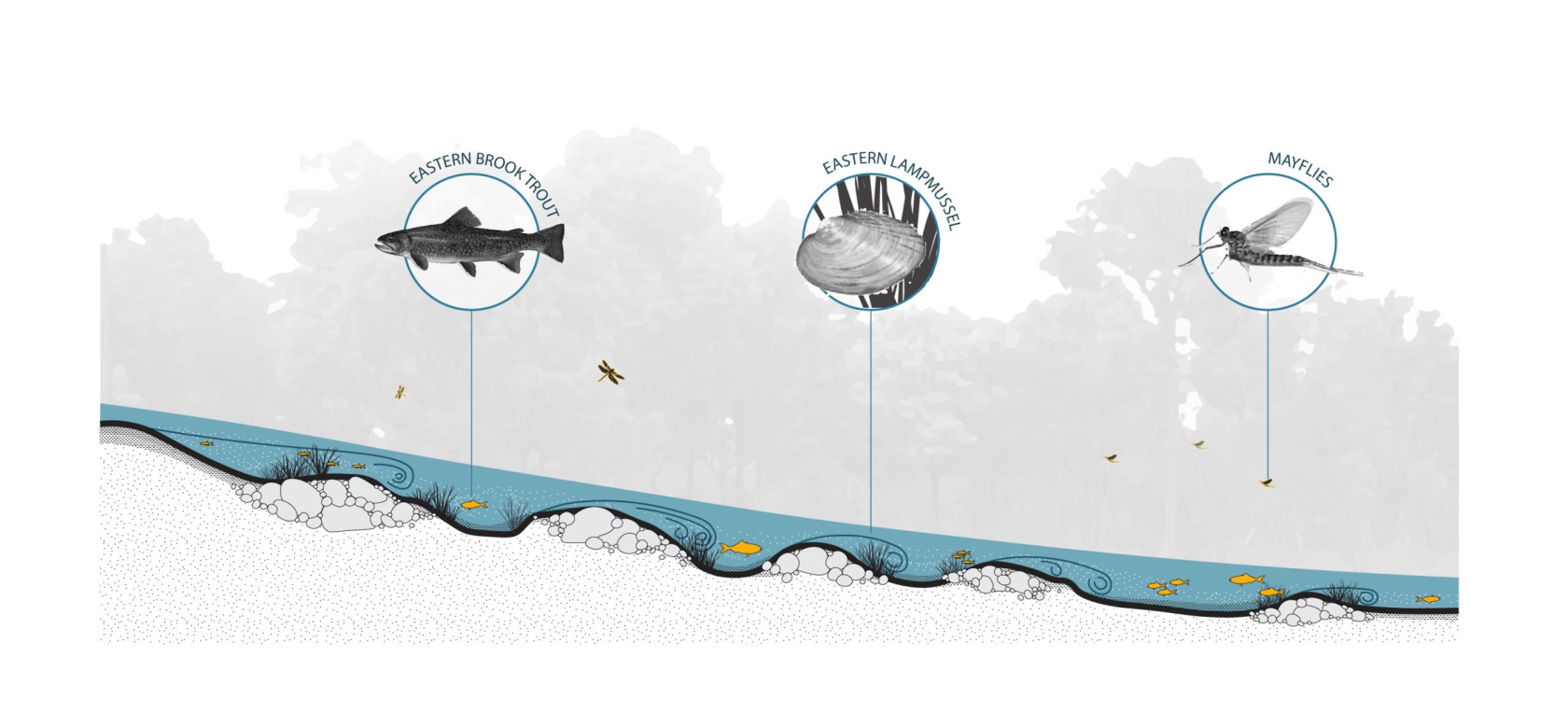 Free-flowing reaches of rivers and streams transport wood, rocks, and other natural debris downstream, where these materials accumulate to create characteristic riffles (shallow rocky areas), pools, and meanders. These habitat features act as shelter for prey species and help to support cold-water fish species such as brook trout, fallfish, blacknose dace, and longnose dace. Free-flowing rivers also support a unique macroinvertebrate fauna of mayflies, stoneflies, caddisflies, midges, craneflies, blackflies, dragonflies and damselflies, crayfish, and mollusks, which feed the aforementioned fish and form the base of the food chain in the freshwater aquatic system. In Rhode Island, Eastern brook trout are listed as a Species of Greatest Conservation Need due to habitat loss, water pollution, climate change, and the presence of dams that disrupt the cold, clear water flows they require. Similarly, several species of freshwater mussels are considered sensitive species because of degraded water quality and the fragmentation of river habitats.