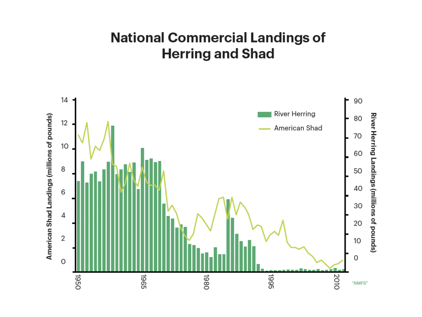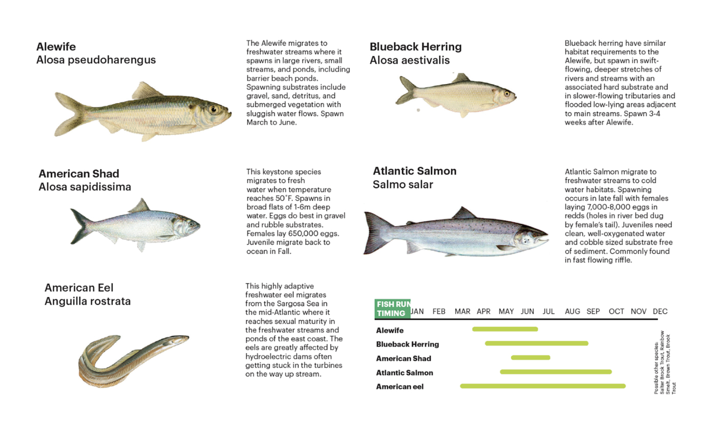 The migration of fish is not only critical for the survival of their species but also contributes to the health of river and ocean ecosystems. Fish like river herring that reproduce in rivers provide the base of the food chain in the ocean, supporting species like tuna, striped bass, sea birds, seals, and whales. When they return to their rivers, they carry nutrients from the ocean into the river ecosystem and feed birds, mammals, and other wildlife, supporting a healthy inland food chain. Disconnecting the two ecosystems impacts the fish, mammal, and bird populations in both. In addition, it damages recreational and subsistence fishing in the Atlantic Ocean.