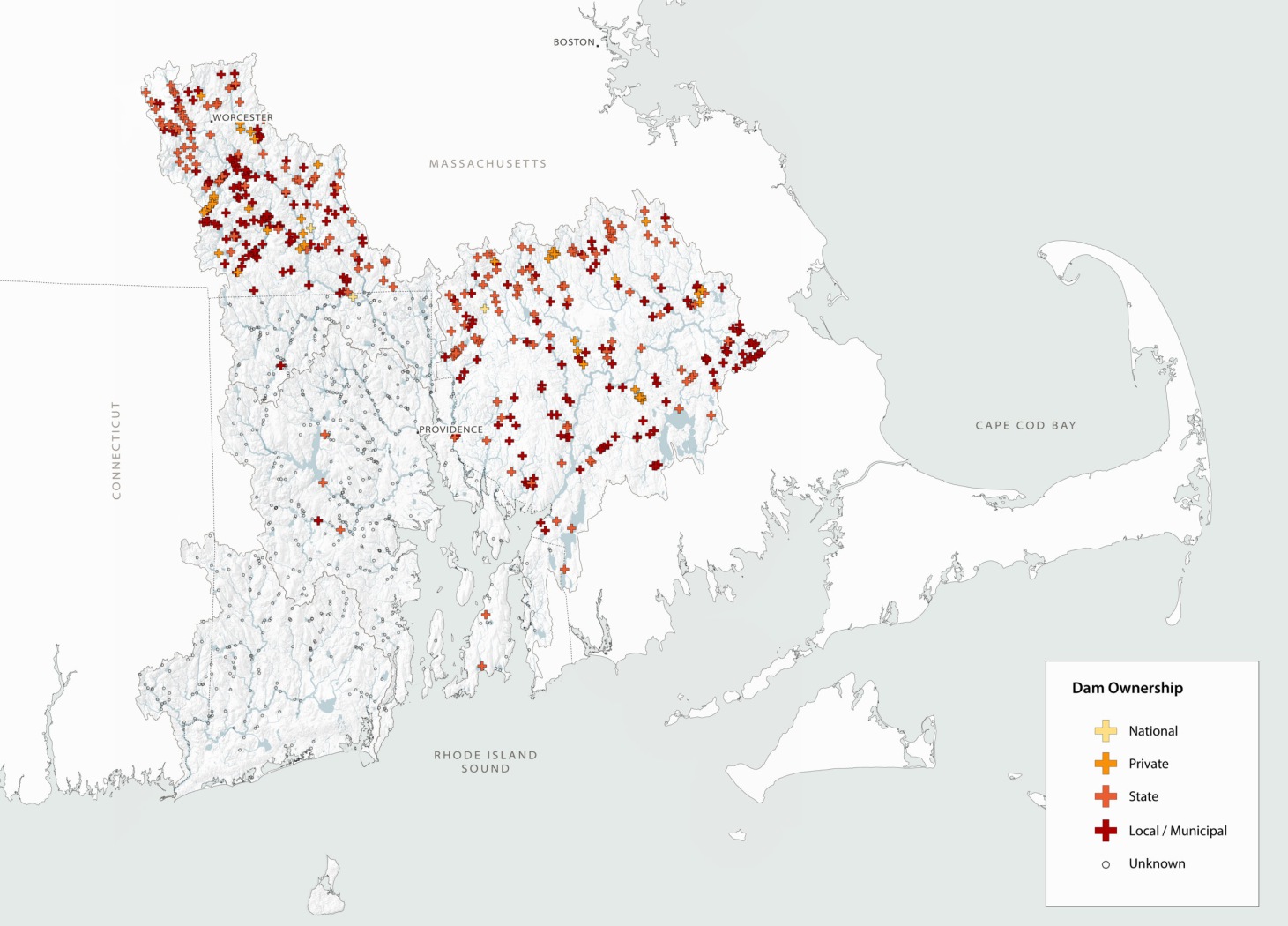 Unlike the large, federally owned dams in the Western and Southeastern United States, most dams in New England were constructed by private individuals and companies to power mills, and many are still privately owned. Within the Narragansett Bay and associated coastal watersheds, records from state regulatory authorities show that 345 dams (34%) are privately owned, 308 dams (30%) are publicly owned, and 377 dams (36%) have unknown private owners and are commonly considered “abandoned”. Typically, when a property with a dam is sold, the ownership and responsibility for the dam is transferred to the new owner. While some landowners may appreciate having a dam on their property, it is also a liability. Dam owners are responsible for the safe operation of the dam and may be liable for injuries or damages due to any accidents or failures of the dam. Furthermore, dam owners incur the costs of regular maintenance and repairs, as well as the acquisition of any necessary licenses or state-required inspections. The 377 dams whose owners are unknown provide a unique challenge for regulating authorities, as many of these dams are in need of repair and the responsible party is not clearly defined. Since many of these dams are more than a century old, ownership information may have been lost or forgotten over the years.