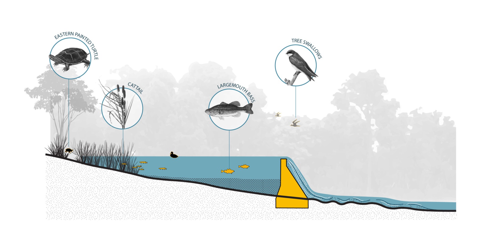 When dams are constructed, the river habitat above the dam is transformed into a lake habitat with warmer temperatures, slow moving water, and lower levels of dissolved oxygen, making the area uninhabitable for cold-water species but newly inhabitable for warm-water species such as non-native large and smallmouth bass, bluegill, and chain pickerel. These are species that are commonly found in lake and pond habitats throughout the region. Within these impoundments, wetlands previously located along the riverbanks, in the floodplains, and underneath the impounded area are pushed out to the shoreline or survive in shallow areas. These surviving wetlands are critical spawning and nursery habitat for a number of fish species. In addition, turtles, amphibians, and fish feed on the abundant invertebrate species that are found among aquatic plants. When a dam is removed, an impoundment that was formerly wetland will usually convert to a floodplain wetland—also an ecologically significant habitat. In some cases, rare and endangered species can be found in the novel lake ecosystems created by the impoundment, and additional studies are required to understand the impact of removing or preserving a dam.